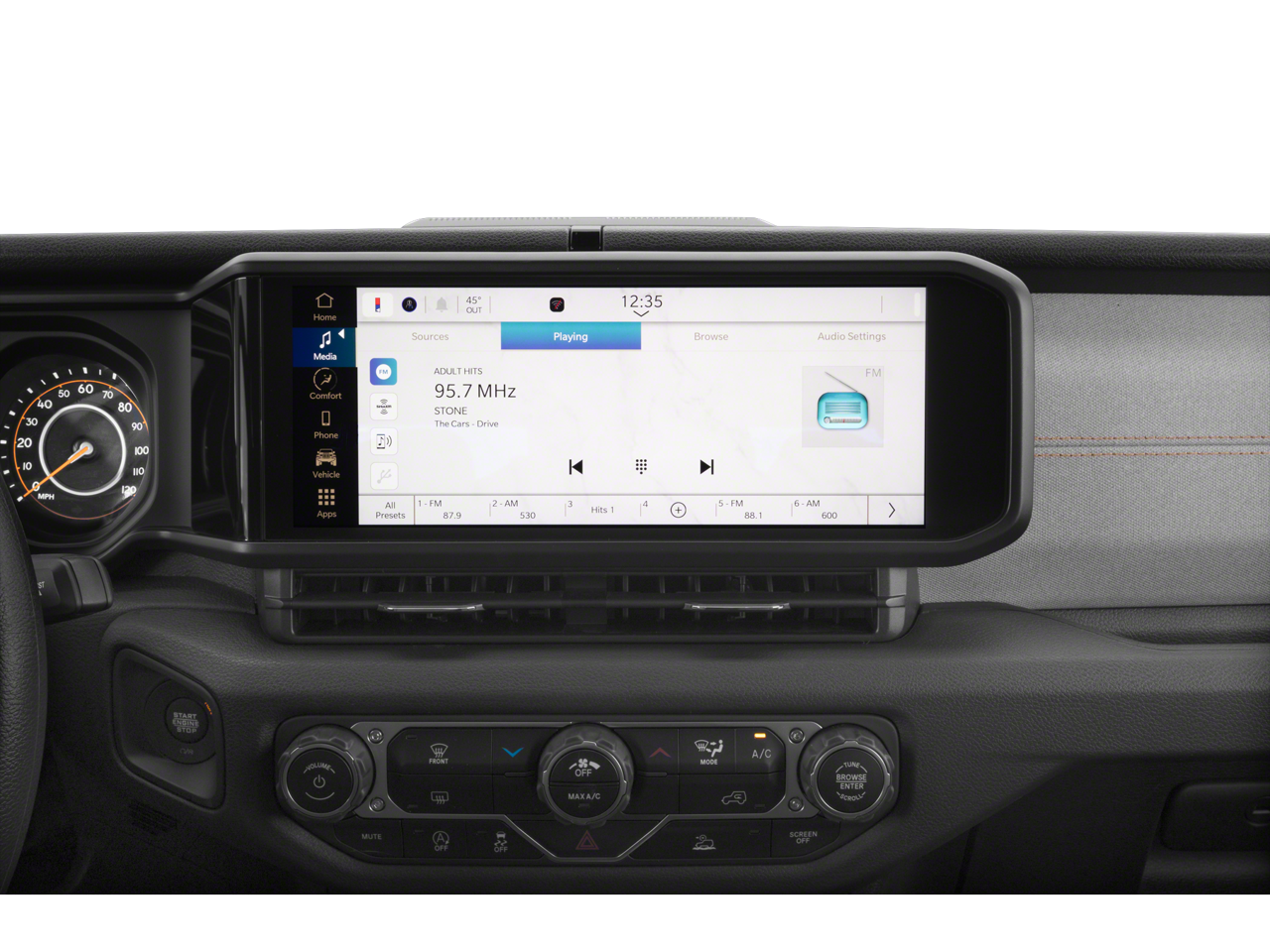 Convenience Group (Air Conditioning with Auto Temp Control, Cluster 7.0 TFT Color Display, Corning Gorilla Glass, Daytime Running Lamp System, Emergency/Assistance Call, Front Door Locks 2-Door Passive Entry, Heated Front Seats, Heated Steering Wheel, Remote Start System, and Universal Garage Door Opener), 110 Mph Vehicle Max Speed Calibration, 12.3 Touchscreen Display, 3.73 Rear Axle Ratio, 4-Wheel Disc Brakes, 4G LTE Wi-Fi Hot Spot, 8 Speakers, ABS brakes, Air Conditioning, Alexa Built-in, AM/FM radio: SiriusXM with 360L, Apple CarPlay, Apple CarPlay/Android Auto, Black 3-Piece Hard Top, Brake assist, Compass, Connectivity - US/Canada, Delay-off headlights, Driver door bin, Driver vanity mirror, Dual front impact airbags, Dual front side impact airbags, Electronic Stability Control, For Details, Visit DriveUconnect.com, Freedom Panel Storage Bag, Front anti-roll bar, Front Bucket Seats, Front Center Armrest w/Storage, Front fog lights, Front reading lights, Google Android Auto, Illuminated entry, Integrated Center Stack Radio, Integrated roll-over protection, Low tire pressure warning, MOPAR Spray in Bedliner, MyFlexCare Service Plan, Normal Duty Suspension, Occupant sensing airbag, Outside temperature display, Overhead airbag, Panic alarm, ParkView Rear Back-Up Camera, Passenger door bin, Passenger vanity mirror, Power steering, Power windows, Radio data system, Radio: Uconnect 5 with 12.3 Display, Rear anti-roll bar, Rear reading lights, Rear Sliding Window, Rear Window Defroster, Remote keyless entry, SiriusXM Radio Service, SiriusXM with 360L, Speed control, Split folding rear seat, Steering wheel mounted audio controls, Tachometer, Telescoping steering wheel, Tilt steering wheel, Traction control, Trip computer, USB Host Flip, Variably intermittent wipers, Voltmeter, and Wheels: 17 x 7.5 Black Steel StyleD.