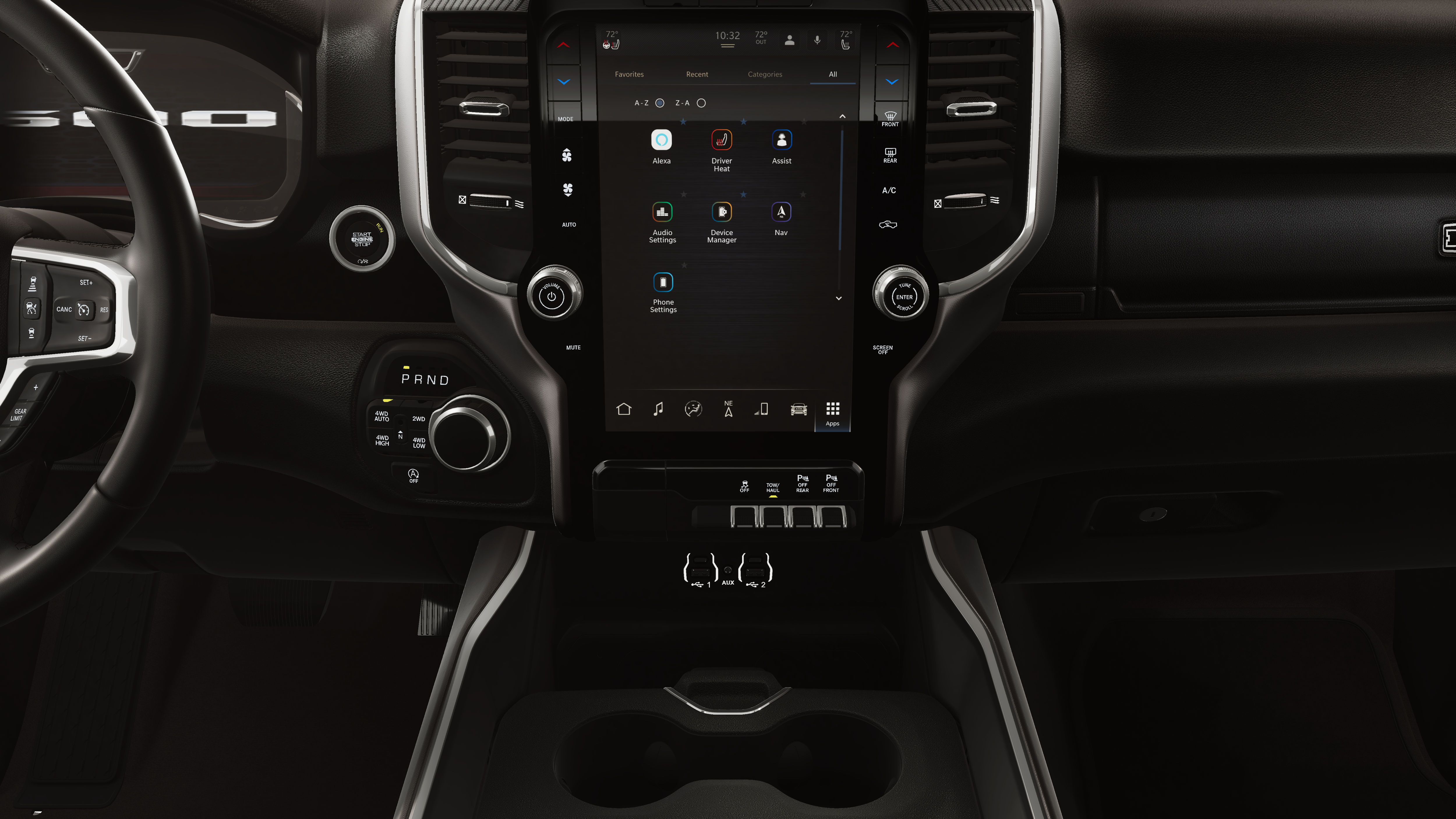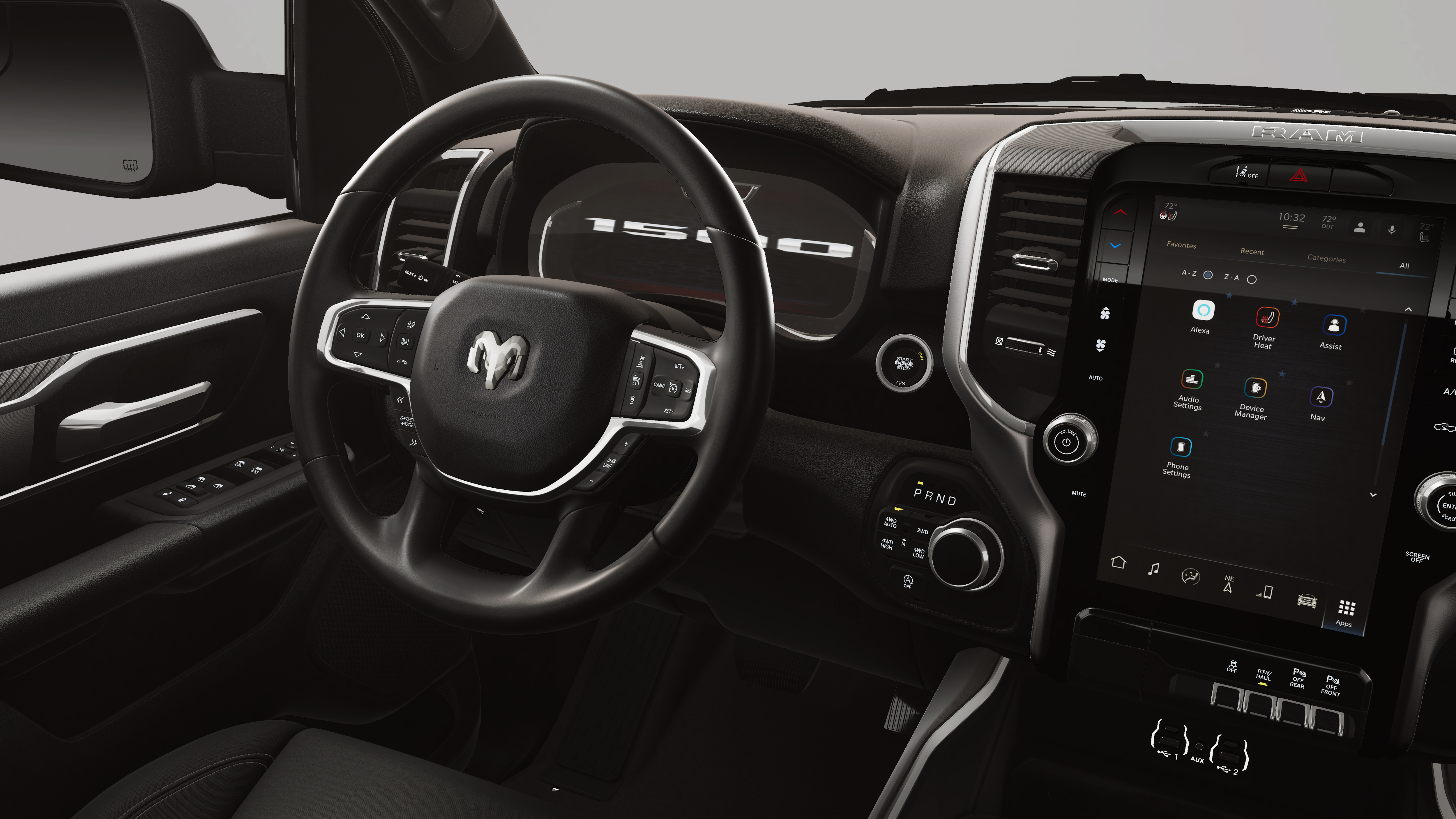 Bed Utility Group (Exterior 115V AC Outlet, MOPAR 4 Adjustable Cargo Tie-Down Hooks, MOPAR Spray in Bedliner, and Pick-Up Box Lighting), Big Horn Level 2 Equipment Group (115V Auxiliary Power Outlet, 115V Auxiliary Rear Power Outlet, 12 Touchscreen Display, 2nd Row in Floor Storage Bins, 3 Rear Seat Head Restraints, 4 Way Front Headrests, 400W Inverter, 4G LTE Wi-Fi Hot Spot, 9 Amplified Speakers with Subwoofer, Air Conditioning ATC with Dual Zone Control, Apple CarPlay, Auto Power-Folding Mirrors, Auto-Dimming Exterior Driver Mirror, Auto-Dimming Rear-View Mirror, Black Exterior Mirrors, Black Premium Power Mirrors, Body Color Fender Flares, Bucket Seats, Center Console Parts Module, Cluster 7.0 TFT Color Display, Configurable Drive Mode, Connected Travel and Traffic Services, Connectivity - US/Canada, Convex Wide-Angle Exterior Mirror Insert, Deluxe Cloth Bucket Seats, Disassociated Touchscreen Display, Exterior Mirrors Courtesy Lamps, Exterior Mirrors with Heating Element, Exterior Mirrors with Supplemental Signals, Front Seat Back Map Pockets, Full Length Floor Console, Global Telematics Box Module, Glove Box Lamp, Google Android Auto, GPS Antenna Input, GPS Navigation, HD Radio, Heated Front Seats, Heated Steering Wheel, Integrated Center Stack Radio, Integrated Voice Command with Bluetooth®, Leather Wrapped Steering Wheel, LED Dome Lamp with on/Off Switch, LED Footwell Lighting, Manual Adjust 4-Way Front Passenger Seat, Media Hub with 2 Charge Only USBs, Overhead LED Lamps, Power 2-Way Driver Lumbar Adjust, Power Adjust 8-Way Driver Seat, Power Adjustable Pedals, Premium Overhead Console, Radio: Uconnect 5 Navigation with 12.0 Display, Rear 60/40 Folding Seat, Rear Center Armrest, Rear Power Sliding Window, Rear Window Defroster, Remote Tailgate Release, Security Alarm, SiriusXM Radio Service, SiriusXM with 360L, Steering Wheel Mounted Audio Controls, Sun Visors with Illuminated Vanity Mirrors, Universal Garage Door Opener, and USB Host Flip), Night Edition (Accent Color Door Handles, Accent Color Premium Power Mirrors, Accent Color Tailgate Handle, Anti-Spin Differential Rear Axle, Black Exterior Truck Badging, Black Headlamp Bezels, Black Interior Accents, Black Painted Exterior Mirrors Caps, Black Tail Lamp Bezels, Body Color Front Bumper, Body Color Rear Bumper with Step Pads, Dual Exhaust with Black Tips, Grille Black Surround Black Mesh, RAM Grille Badge - Black, and Wheels: 20 x 9.0 Aluminum Painted Clad), 4-Wheel Disc Brakes, 48V Belt Starter Generator, 6 Speakers, ABS brakes, Air Conditioning, Alloy wheels, AM/FM radio, Apple CarPlay/Android Auto, Auto High-beam Headlights, Brake assist, Bumpers: chrome, Cloth Bucket Seats, Cluster 12 TFT Color Display, Compass, Delay-off headlights, Dome Dual LED Reading Lamp, Driver door bin, Dual front impact airbags, Dual front side impact airbags, Dual-Pane Panoramic Sunroof, Electronic Stability Control, Front anti-roll bar, Front Bucket Seats, Front Center Armrest w/Storage, Front fog lights, Front reading lights, Front wheel independent suspension, Fully automatic headlights, Heated door mirrors, Illuminated entry, Low tire pressure warning, Manual Adjust 4-Way Driver Seat, Manual Folding Exterior Mirrors, Occupant sensing airbag, Outside temperature display, Overhead airbag, Overhead console, Panic alarm, ParkView Rear Back-Up Camera, Passenger door bin, Passenger vanity mirror, Power door mirrors, Power steering, Power windows, Radio data system, Radio: Uconnect 5 W with 8.4 Display, RAM Grille Badge - Chrome, Rear anti-roll bar, Rear step bumper, Rear Underseat Compartment Storage, Remote keyless entry, Speed control, Supplier Part Tracking (J-1), Tachometer, Telescoping steering wheel, Tilt steering wheel, Traction control, Trip computer, Variably intermittent wipers, and Voltmeter.