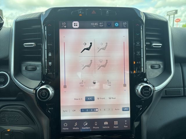 Big Horn Level 2 Plus Equipment Group (115-Volt Auxiliary Front Power Outlet, 115V Auxiliary Rear Power Outlet, 12 Touchscreen Display, 2 Way Rear Headrest Seat, 2nd Row in Floor Storage Bins, 4 Way Front Headrests, 400W Inverter, 4G LTE Wi-Fi Hot Spot, 9 Alpine Speakers with Subwoofer, Active Lane Management System, Adaptive Steering System, Air Conditioning ATC with Dual Zone Control, Alexa Built-in, Anti-Spin Differential Rear Axle, Apple CarPlay, Auto High Beam Headlamp Control, Auto Power-Folding Mirrors, Auto-Dimming Rear-View Mirror, Black Exterior Mirrors, Blind Spot and Cross Path Detection, Bucket Seats, Center Stop Lamp with Cargo View Camera, Cluster 7.0 TFT Color Display, Connected Travel and Traffic Services, Connectivity - US/Canada, Dampened Tailgate, Disassociated Touchscreen Display, Drowsy Driver Detection, Dual Glove Boxes, Dual Wireless Charging Pad, Emergency Vehicle Alert System (EVAS), Exterior 115V AC Outlet, Exterior Mirrors Courtesy Lamps, Exterior Mirrors with Heating Element, Exterior Mirrors with Supplemental Signals, Foam Bottle Insert (door Trim Panel), Folding Flat Load Floor Storage, Footwell Courtesy Lamp, For Details, Visit DriveUconnect.com, For More Info, Call 800-643-2112, Forward and Reverse Utility Lights, Front Seat Back Map Pockets, Full Length Upgraded Floor Console, Global Telematics Box Module, Glove Box Lamp, Google Android Auto, GPS Antenna Input, GPS Navigation, HD Radio, Heated Front Seats, Heated Steering Wheel, Integrated Voice Command with Bluetooth®, LED Bed Lighting, LED Tail Lamps, Locking Lower Glove Box, Luxury Steering Wheel, Manual Adjust 4-Way Front Passenger Seat, Media Hub with 2 Charge Only USBs, Mirror Running Lights, MOPAR Deployable Bed Step, MOPAR Spray in Bedliner, MOPAR Trailer Camera Wiring with No Camera, Off-Road Info Pages, Power 2-Way Driver Lumbar Adjust, Power Adjust 8-Way Driver Seat, Power Adjust Mirrors, Power Adjustable Pedals, Power Heated Folding Telescopic Mirrors, Power Telescoping Mirrors, Power-Adjustable Convex Aux Mirrors, Premium Cloth Bucket Seats, Radio: Uconnect 5 Navigation with 12.0 Display, Rain Sensitive Windshield Wipers, Rear 60/40 Folding Seat, Rear Dome with on/Off Switch Lamp, Rear Power Sliding Window, Red Tail Lamp Bezels, Remote Start System, Selectable Tire Fill Alert, SiriusXM Radio Service, SiriusXM with 360L, Steering Wheel Mounted Audio Controls, Sun Visors with Illuminated Vanity Mirrors, Surround View Camera System, Traffic Sign Recognition, Trailer Reverse Guidance, Trailer Tire Pressure Monitoring System, Trailer Tow Pages, and Universal Garage Door Opener), Night Edition (Black Exterior Truck Badging, Black Interior Accents, Black Wheel Center Hub, Body Color Grille-Surround, Gloss Black Nostrils/Mic Black Grille, Painted Front Bumper, Painted Rear Bumper, and Wheels: 20 x 8.0 Black Painted Aluminum), on Board Power System - 2.4KW, Quick Order Package 24Z Big Horn, 4-Wheel Disc Brakes, 40/20/40 Split Bench Seat, 5th Wheel/Gooseneck Towing Prep Group, 6 Speakers, ABS brakes, Air Conditioning, Alloy wheels, AM/FM radio: SiriusXM, Apple CarPlay/Android Auto, Brake assist, Bumpers: chrome, Center Hub, Clearance Lamps, Cloth 40/20/40 Bench Seat, Compass, Dash Pass Thru Wire Circuits, Delay-off headlights, Driver door bin, Dual Alternators Rated At 480 Amps, Dual front impact airbags, Dual front side impact airbags, Electronic Stability Control, Front anti-roll bar, Front Armrest with Cupholders, Front Center Armrest w/Storage, Front fog lights, Front License Plate Bracket, Front reading lights, Fully automatic headlights, Heated door mirrors, Illuminated entry, Instrument Panel Mounted Auxiliary Switches, Low tire pressure warning, Manual Adjust 4-Way Driver Seat, MOPAR Front and Rear Rubber Floor Mats, MyFlexCare Service Diesel, Occupant sensing airbag, Outside temperature display, Overhead airbag, Overhead console, Panic alarm, ParkView Rear B
