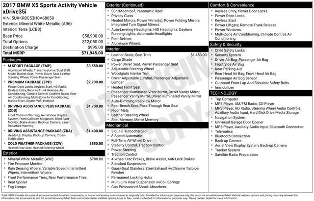 White Metallic 2017 BMW X5 xDrive35i Sport Activity AWD 8-Speed Automatic 3.0L I6 DOHC 24V TwinPower Turbo Terra Leather.