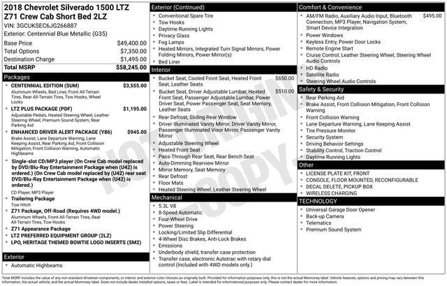 Clean CARFAX. Centennial Blue Metallic 2018 Chevrolet Silverado 1500 LTZ 2LZ 4WD 8-Speed Automatic with Overdrive EcoTec3 5.3L V8 8-Speed Automatic with Overdrive, 4WD, Jet Black Leather.
