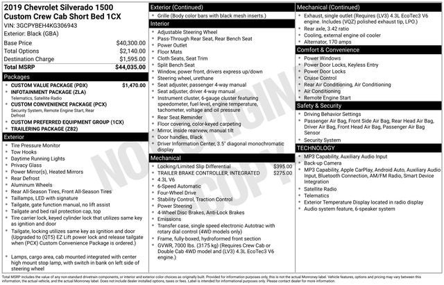 CARFAX One-Owner. Black 2019 Chevrolet Silverado 1500 Custom 4WD 6-Speed Automatic Electronic with Overdrive EcoTec3 4.3L V6 6-Speed Automatic Electronic with Overdrive, 4WD, Black Cloth.