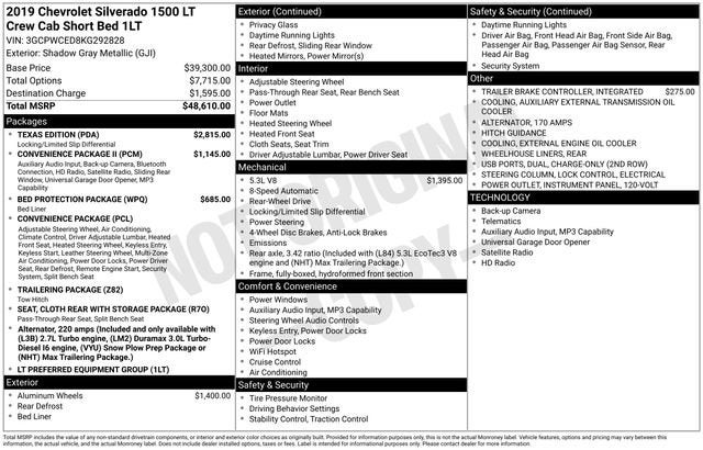 Bed Protection Package (Chevytec Spray-On Black Bedliner and Rear Wheelhouse Liners), Cloth Rear Seat w/Storage Package, Convenience Package (10-Way Power Driver Seat w/Lumbar, 12-Volt Rear Auxiliary Power Outlet, 40/20/40 Front Split-Bench Seat, Dual-Zone Automatic Climate Control, Electric Rear-Window Defogger, Electrical Lock Control Steering Column, EZ Lift Power Lock & Release Tailgate, Heated Driver & Front Passenger Seats, Heated Steering Wheel, Keyless Open & Start, Leather Wrapped Steering Wheel, LED Cargo Area Lighting, Manual Tilt/Telescoping Steering Column, Rear Dual USB Charging-Only Ports, Remote Vehicle Starter System, and Theft Deterrent System (Unauthorized Entry)), Convenience Package II (120-Volt Bed Mounted Power Outlet, 120-Volt Instrument Panel Power Outlet, 2 USB Ports, HD Radio, HD Rear Vision Camera, Power Sliding Rear Window w/Rear Defogger, Radio: Chevrolet Infotainment 3 Plus System, SiriusXM Radio, and Universal Home Remote), Preferred Equipment Group 1LT (2 USB Ports (First Row), 4-Way Manual Driver Seat Adjuster, 4.2 Diagonal Color Display Driver Info Center, Bluetooth® For Phone, Chevrolet Connected Access, Chevrolet w/4G LTE, Chrome Grille, Chrome Mirror Caps, Color-Keyed Carpeting Floor Covering, Compass, Deep-Tinted Glass, Electronic Cruise Control, Front Rubberized Vinyl Floor Mats, Locking Tailgate, Manual Tilt Wheel Steering Column, OnStar & Chevrolet Connected Services Capable, Power Door Locks, Power Front Windows w/Driver Express Up/Down, Power Front Windows w/Passenger Express Down, Power Rear Windows w/Express Down, Rear 60/40 Folding Bench Seat (Folds Up), Rear Rubberized-Vinyl Floor Mats, Rear Vision Camera, Remote Keyless Entry, Single-Zone Manual/Semi-Automatic Air Conditioning, Steering Wheel Audio Controls, and Urethane Steering Wheel), Texas Edition (Heavy-Duty Rear Locking Differential and Texas Edition Badging), Trailering Package (Hitch Guidance), 8-Speed Automatic, Jet Blk Clth Cloth, 170 Amp Alternator, 220 Amps Alternator, 3.23 Rear Axle Ratio, 4-Wheel Disc Brakes, 40/20/40 Front Split Bench Seat, 6 Speakers, ABS brakes, Air Conditioning, Alloy wheels, AM/FM radio, Apple CarPlay/Android Auto, Auxiliary External Transmission Oil Cooler, Brake assist, Bumpers: chrome, Cloth Seat Trim, Delay-off headlights, Driver door bin, Driver vanity mirror, Dual front impact airbags, Dual front side impact airbags, Electronic Stability Control, External Engine Oil Cooler, Front anti-roll bar, Front Center Armrest w/Storage, Front License Plate Kit, Front reading lights, Front wheel independent suspension, Fully automatic headlights, Heated door mirrors, Heavy Duty Suspension, Illuminated entry, Integrated Trailer Brake Controller, Low tire pressure warning, Occupant sensing airbag, Outside temperature display, Overhead airbag, Overhead console, Panic alarm, Passenger door bin, Passenger vanity mirror, Power door mirrors, Power steering, Power windows, Premium audio system: Chevrolet Infotainment System 3, Radio data system, Radio: Chevrolet Infotainment 3 System, Rear reading lights, Rear step bumper, Remote keyless entry, Speed control, Speed-sensing steering, Split folding rear seat, Steering wheel mounted audio controls, Tachometer, Tilt steering wheel, Traction control, Trip computer, Variably intermittent wipers, Voltmeter, Wheels: 17 x 8 Bright Silver Painted Aluminum, and Wheels: 20 x 9 Painted Aluminum. Recent Arrival! 8-Speed Automatic, Jet Blk Clth Cloth.2019 Chevrolet Silverado 1500 LT RWD 8-Speed Automatic EcoTec3 5.3L V8 Shadow Gray Metallic