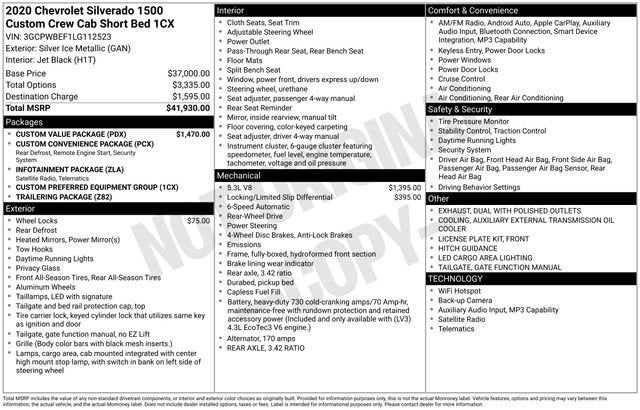 Custom Convenience Package (Electric Rear-Window Defogger, EZ Lift Power Lock & Release Tailgate, LED Cargo Area Lighting, Remote Vehicle Starter System, and Theft Deterrent System (Unauthorized Entry)), Custom Value Package, Infotainment Package (4G LTE Wi-Fi Hot Spot Capable, Chevrolet Connected Access Capable, Compass, OnStar & Chevrolet Connected Services Capable, and SiriusXM Radio), Preferred Equipment Group 1CX (170 Amps Alternator, 3.5 Diagonal Monochromatic Display, Bluetooth® For Phone, Body Color Grille, Color-Keyed Carpeting Floor Covering, Deep-Tinted Glass, Front Frame-Mounted Black Recovery Hooks, Front Rubberized Vinyl Floor Mats, Locking Tailgate, Manual Tilt-Wheel Steering Column, Power Door Locks, Power Front Windows w/Driver Express Up/Down, Power Front Windows w/Passenger Express Down, Power Rear Windows w/Express Down, Rear 60/40 Folding Bench Seat (Folds Up), Rear Rubberized-Vinyl Floor Mats, Remote Keyless Entry, and Steering Wheel Mounted Electronic Cruise Control), Trailering Package (Hitch Guidance), 6-Speed Automatic Electronic with Overdrive, Black Cloth, 3.42 Rear Axle Ratio, 4-Wheel Disc Brakes, 6 Speakers, ABS brakes, Air Conditioning, Alloy wheels, Apple CarPlay/Android Auto, Auxiliary External Transmission Oil Cooler, Brake assist, Bumpers: body-color, Cloth Seat Trim, Delay-off headlights, Driver door bin, Driver vanity mirror, Dual Exhaust w/Polished Outlets, Dual front impact airbags, Dual front side impact airbags, Electronic Stability Control, Exterior Parking Camera Rear, Front 40/20/40 Split-Bench Seat, Front anti-roll bar, Front Center Armrest, Front License Plate Kit, Front reading lights, Front wheel independent suspension, Fully automatic headlights, Heated door mirrors, Heavy Duty Suspension, Heavy-Duty Rear Locking Differential, Illuminated entry, Low tire pressure warning, Occupant sensing airbag, Outside temperature display, Overhead airbag, Overhead console, Panic alarm, Passenger door bin, Passenger vanity mirror, Polished Exhaust Tip, Power door mirrors, Power steering, Power windows, Radio data system, Radio: Chevrolet Infotainment 3 System, Rear reading lights, Rear step bumper, Remote keyless entry, Speed control, Speed-sensing steering, Split folding rear seat, Tachometer, Tilt steering wheel, Traction control, Trip computer, Variably intermittent wipers, Voltmeter, Wheel Locks (Set of 4) (LPO), and Wheels: 20 x 9 Bright Silver Painted Aluminum. Recent Arrival! 6-Speed Automatic Electronic with Overdrive, Black Cloth.