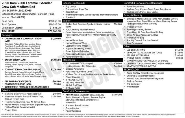 CARFAX One-Owner. Diamond Black Crystal Pearlcoat 2020 Ram 2500 Laramie 4WD 6-Speed Automatic Cummins 6.7L I6 Turbodiesel