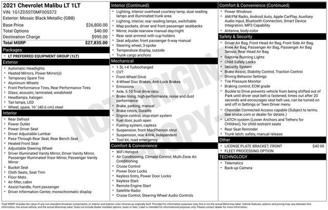 2021 Chevrolet Malibu LT FWD CVT 1.5L DOHC Black Metallic