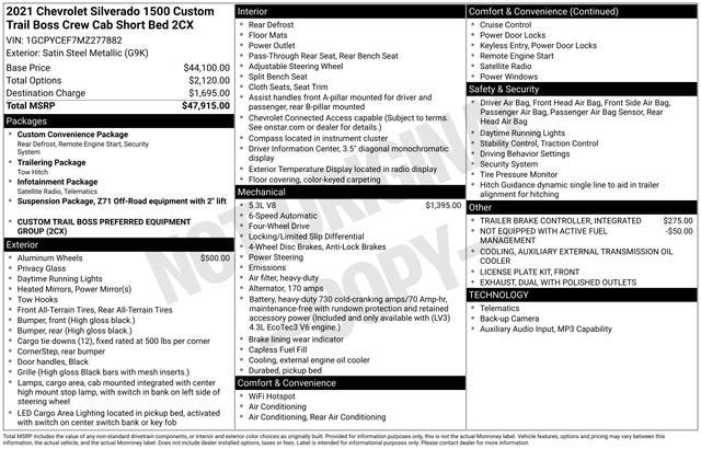 Custom Convenience Package (Electric Rear-Window Defogger, EZ Lift Power Lock & Release Tailgate, LED Cargo Area Lighting, Remote Vehicle Starter System, and Theft Deterrent System (Unauthorized Entry)), Infotainment Package (4G LTE Wi-Fi Hot Spot Capable, Chevrolet Connected Access Capable, OnStar & Chevrolet Connected Services Capable, and SiriusXM Radio), Preferred Equipment Group 2CX (170 Amp Alternator, 3.5 Diagonal Monochromatic Display, Auto-Locking Rear Differential, Bluetooth® For Phone, Color-Keyed Carpeting Floor Covering, Compass, Deep-Tinted Glass, Electronic Cruise Control, Front Rubberized Vinyl Floor Mats, High Gloss Black Grille, Manual Tilt Wheel Steering Column, Performance Red Recovery Hooks, Power Door Locks, Power Front Windows w/Driver Express Up/Down, Power Front Windows w/Passenger Express Down, Power Rear Windows w/Express Down, Rear 60/40 Folding Bench Seat (Folds Up), Rear Rubberized-Vinyl Floor Mats, Remote Keyless Entry, and Standard Tailgate), Suspension Package (Heavy-Duty Air Filter and Hill Descent Control), Trailering Package (Hitch Guidance), 6-Speed Automatic Electronic with Overdrive, 4WD, Black Cloth, 3.42 Rear Axle Ratio, 4-Wheel Disc Brakes, 40/20/40 Front Split Bench Seat, 6 Speakers, ABS brakes, Air Conditioning, Alloy wheels, AM/FM radio: SiriusXM, Apple CarPlay/Android Auto, Auxiliary External Transmission Oil Cooler, Brake assist, Cloth Seat Trim, Delay-off headlights, Driver door bin, Driver vanity mirror, Dual Exhaust w/Polished Outlets, Dual front impact airbags, Dual front side impact airbags, Electronic Stability Control, Front anti-roll bar, Front Center Armrest w/Storage, Front License Plate Kit, Front reading lights, Front wheel independent suspension, Fully automatic headlights, Heated door mirrors, Illuminated entry, Integrated Trailer Brake Controller, Low tire pressure warning, Not Equipped w/Active Fuel Management, Occupant sensing airbag, Off-Road Suspension w/2 Lift, Outside temperature display, Overhead airbag, Overhead console, Panic alarm, Passenger door bin, Passenger vanity mirror, Polished Exhaust Tip, Power door mirrors, Power steering, Power windows, Premium audio system: Chevrolet Infotainment 3, Radio data system, Radio: Chevrolet Infotainment 3 System, Rear reading lights, Rear step bumper, Rear window defroster, Remote keyless entry, Security system, Speed control, Speed-sensing steering, Split folding rear seat, Tachometer, Tilt steering wheel, Traction control, Trip computer, Variably intermittent wipers, Voltmeter, Wheels: 18 x 8.5 Black Painted Aluminum, and Wheels: 20 x 9 High Gloss Black Painted Alum. 6-Speed Automatic Electronic with Overdrive, 4WD, Black Cloth.2021 Chevrolet Silverado 1500 Custom Trail Boss 4WD 6-Speed Automatic Electronic with Overdrive EcoTec3 5.3L V8 Satin Steel Metallic