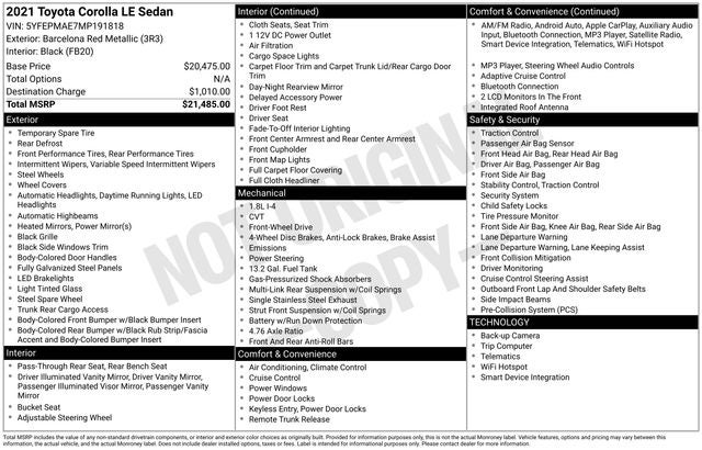 Discover the perfect blend of style, technology, and efficiency in this stunning 2021 Toyota Corolla LE. This compact sedan boasts a sleek exterior in a vibrant Red color, complemented by a well-appointed interior that combines comfort and convenience.