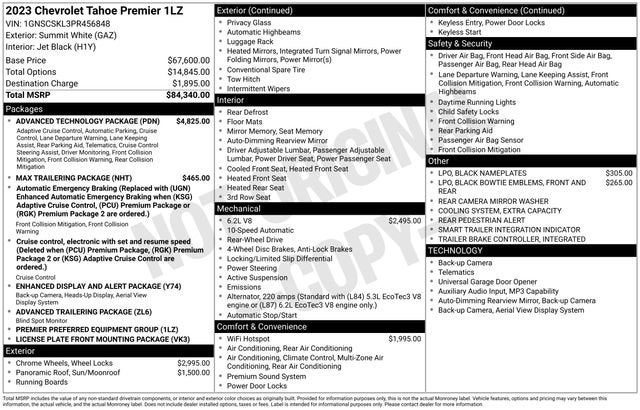 Advanced Technology Package (Adaptive Cruise Control, Enhanced Automatic Emergency Braking, Enhanced Automatic Parking Assist, and Reverse Automatic Braking), Advanced Trailering Package (Hitch Guidance w/Hitch View, Integrated Trailer Brake Controller, Smart Trailer Integration Indicator, and Trailer Side Blind Zone Alert), Enhanced Display & Alert Package (15 Diagonal Multi-Color Head-Up Display, HD Surround Vision, Inside Rearview Auto-Dimming Rear Camera Mirror, Rear Camera Mirror Washer, and Rear Pedestrian Alert), License Plate Front Mounting Package, Max Trailering Package (Extra Capacity Cooling System), Preferred Equipment Group 1LZ (1st & 2nd Row Color-Keyed Carpeted Floor Mats, 3rd Row 60/40 Power-Folding Split-Bench Seat, Auto-Dimming Inside Rear-View Mirror, Bose 10-Speaker Centerpoint Surround Audio Sys Ft, Bright Front & Rear Door Sill Plates, Chrome Door Handles w/Body-Color Strip, Chrome Mirror Caps, Color-Keyed Carpeting Floor Covering, Driver & Front Outboard Passenger Airbags, Dual Exhaust System, Enhanced Driver Information Center, Floor Console, Hands-Free Rear Power Programmable Liftgate, Heated 2nd Row Outboard Seats, Heated Steering Wheel, Infotainment Display, Lane Change Alert w/Side Blind Zone Alert, LED Daytime Running Lamps, Memory Settings, Outside Heated Power-Adjustable Mirrors, Power Release 2nd Row Bucket Seats, Power Tilt & Telescopic Steering Column, Rear Cross Traffic Alert, Remote Start, Safety Alert Seat, SiriusXM Radio w/360L, Universal Home Remote, Wireless Charging, and Wrapped Steering Wheel), Jet Black Leather, 10 Speakers, 20 x 9 Polished Aluminum Wheels, 3.23 Rear Axle Ratio, 3rd row seats: split-bench, 4-Wheel Disc Brakes, ABS brakes, Adaptive suspension, Air Conditioning, Alloy wheels, AM/FM radio: SiriusXM with 360L, Apple CarPlay/Android Auto, Auto High-beam Headlights, Auto-dimming door mirrors, Auto-dimming Rear-View mirror, Auto-leveling suspension, Automatic temperature control, Black Name Plates (LPO), Brake assist, Bumpers: body-color, Compass, Delay-off headlights, Driver door bin, Driver vanity mirror, Dual front impact airbags, Dual front side impact airbags, Dual-Pane Power Panoramic Sunroof, Electronic Stability Control, Emergency communication system: OnStar and Chevrolet connected services capable, Four wheel independent suspension, Front & Rear Black Bowtie Emblems (LPO), Front anti-roll bar, Front Bucket Seats, Front Center Armrest, Front dual zone A/C, Front High-Back Reclining Bucket Seats, Front reading lights, Fully automatic headlights, Garage door transmitter, Heated & Ventilated Driver & Front Passenger Seats, Heated door mirrors, Heated Driver & Front Passenger Seats, Heated front seats, Heated rear seats, Heated steering wheel, Illuminated entry, Low tire pressure warning, Magnetic Ride Control Suspension, Memory seat, Navigation System, Occupant sensing airbag, Outside temperature display, Overhead airbag, Overhead console, Panic alarm, Passenger door bin, Passenger vanity mirror, Perforated Leather Seat Trim, Power door mirrors, Power driver seat, Power Liftgate, Power passenger seat, Power steering, Power windows, Premium audio system: Chevrolet Infotainment 3 Premium, Radio: Chevrolet Infotainment 3 Premium System, Rain sensing wipers, Rear air conditioning, Rear anti-roll bar, Rear reading lights, Rear Seat Media System, Rear window defroster, Rear window wiper, Remote keyless entry, Roof rack: rails only, Security system, Speed control, Speed-sensing steering, Split folding rear seat, Spoiler, Steering wheel memory, Steering wheel mounted audio controls, Super Cruise (DISC), Tachometer, Telescoping steering wheel, Tilt steering wheel, Traction control, Trip computer, Turn signal indicator mirrors, Variably intermittent wipers, Ventilated front seats, Voltmeter, Wheels: 22 Multi-Spoke Gloss Black (LPO), and Wheels: 22 x 9 Steel Interim (LPO) Jet Black Leather.