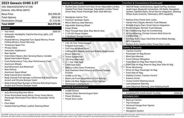 Advanced Package (3-Zone Climate Control, Blind-Spot View Monitor, Ergo Motion Driver Seat, Head-Up Display, Heated 2nd Row Seats, Option Group 06, Parking Collision-Avoidance Assist, Power Cushion Extension & Bolster, Radio: AM/FM/SiriusXM/HD Lexicon Prem Audio System, Remote Smart Parking Assist, and Surround View Monitor), Prestige 20 Package, 12 Speakers, 12.3 3D Digital Instrument Cluster, 2nd Row Vanity Mirrors, 3.909 Axle Ratio, 4-Wheel Disc Brakes, ABS brakes, Adaptive suspension, Air Conditioning, Alloy wheels, AM/FM radio: SiriusXM, Android Auto & Apple CarPlay, Anti-whiplash front head restraints, Auto High-beam Headlights, Auto tilt-away steering wheel, Auto-dimming door mirrors, Auto-dimming Rear-View mirror, Automatic temperature control, Brake assist, Bumpers: body-color, Compass, Delay-off headlights, Driver door bin, Driver vanity mirror, Dual front impact airbags, Dual front side impact airbags, Electronic Limited Slip Differential, Electronic Stability Control, Emergency communication system: Genesis Connected Services, Exterior Parking Camera Rear, Forward Attention Warning, Four wheel independent suspension, Front anti-roll bar, Front Bucket Seats, Front Center Armrest, Front dual zone A/C, Front reading lights, Fully automatic headlights, Garage door transmitter: HomeLink, Genuine wood console insert, Genuine wood dashboard insert, Genuine wood door panel insert, Heated & Ventilated Front Bucket Seats, Heated door mirrors, Heated front seats, Heated steering wheel, Illuminated Door Scuff Plates, Illuminated entry, Knee airbag, Leather Seating Surfaces, Leather steering wheel, Leatherette Seating Surfaces, Low tire pressure warning, Memory seat, Nappa Leather Seating Surfaces, Navigation System, Occupant sensing airbag, Outside temperature display, Overhead airbag, Overhead console, Panic alarm, Passenger door bin, Passenger vanity mirror, Power 2nd Row Outboard Seats, Power Door Closure, Power door mirrors, Power driver seat, Power Liftgate, Power moonroof, Power passenger seat, Power Rear Door Shades, Power steering, Power windows, Radio data system, Radio: AM/FM/SiriusXM/HD Audio System, Rain sensing wipers, Rear air conditioning, Rear anti-roll bar, Rear reading lights, Rear seat center armrest, Rear side impact airbag, Rear window defroster, Rear window wiper, Remote keyless entry, Road Active Noise Control, Security system, Speed control, Speed-sensing steering, Speed-Sensitive Wipers, Split folding rear seat, Spoiler, Steering wheel memory, Steering wheel mounted audio controls, Suede Headliner, Tachometer, Telescoping steering wheel, Tilt steering wheel, Tow Hitch, Traction control, Trip computer, Turn signal indicator mirrors, Variably intermittent wipers, Ventilated 2nd Row Outboard Seats, Ventilated front seats, and Wheels: 20 x 8.5J Medium Metallic Gray Alloy. Recent Arrival!2023 Genesis GV80 3.5T AWD 8-Speed Automatic 3.5L DOHC White