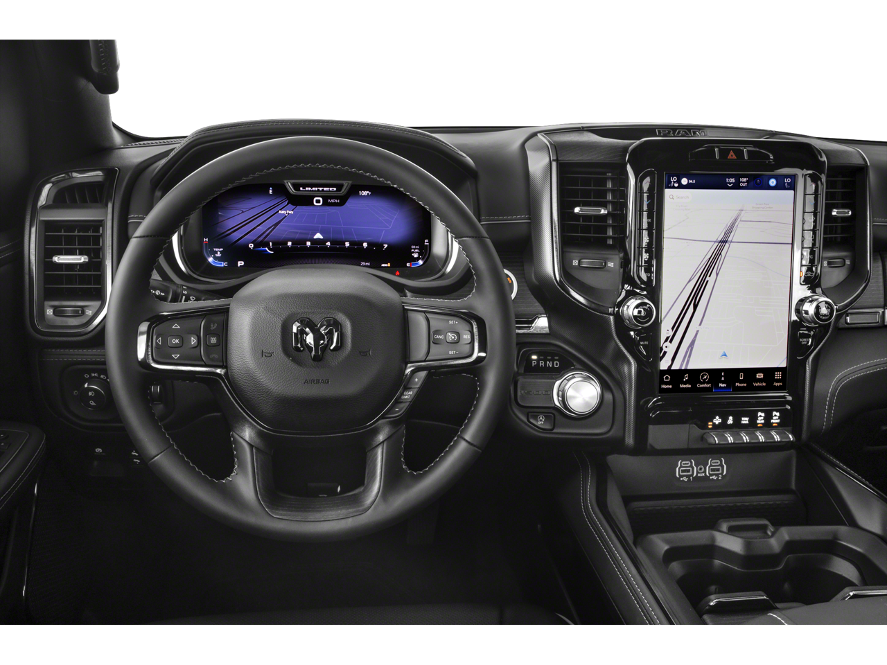 Limited Level 1 Equipment Group (Adaptive Cruise Control w/Stop & Go, Digital Rearview Mirror, Heads-Up Display, Lane Keep Assist, LED CHMSL Lamp, MOPAR Spray In Bedliner, Parallel & Perp Park Assist w/Stop, ParkSense Front/Rear Park Assist w/Stop, Pedestrian Emergency Braking, Pick-Up Box Lighting, Power Running Boards, Surround View Camera System, Tailgate Ajar Warning Lamp, and Wireless Charging Pad), Night Edition (Accent Color Door Handles, Accent Color Premium Power Mirrors, Auto-Dimming Exterior Driver Mirror, Black Day Light Opening Moldings, Black Exterior Truck Badging, Black Grille Surround Texture 7 Black, Black Headlamp Bezels, Black Painted Exterior Mirrors Caps, Body Color Front Bumper, Body Color Rear Bumper w/Step Pads, Convex Wide-Angle Exterior Mirror Insert, Dual Exhaust w/Black Tips, Exterior Mirrors Courtesy Lamps, Exterior Mirrors w/Heating Element, Exterior Mirrors w/Memory, Exterior Mirrors w/Supplemental Signals, harman/kardon 19 Speaker Premium Sound, Power-Folding Mirrors, RAM Grille Badge - Black, Sport Performance Hood, Tow Hooks, Tri-Fold Tonneau Cover, and Wheels: 22 x 9 Black Aluminum), Quick Order Package 27M Limited, 10 Speakers, 3.21 Rear Axle Ratio, 3.92 Rear Axle Ratio, 33 Gallon Fuel Tank, 4 Way Front Headrests, 4-Wheel Disc Brakes, 48V Belt Starter Generator, ABS brakes, Active Noise Control System, Adjustable pedals, Air Conditioning, Alloy wheels, AM/FM radio: SiriusXM with 360L, Anti-Spin Differential Rear Axle, Apple CarPlay/Android Auto, Audio memory, Auto High-beam Headlights, Auto-dimming door mirrors, Auto-dimming Rear-View mirror, Auto-leveling suspension, Automatic temperature control, Bodyside moldings, Brake assist, Bucket Seats, Bumpers: chrome, Chrome Exterior Mirrors, Compass, Delay-off headlights, Driver door bin, Driver Seat Memory, Driver vanity mirror, Dual front impact airbags, Dual front side impact airbags, Dual Rear Exhaust w/Bright Tips, Electronic Stability Control, Front anti-roll bar, Front Bucket Seats, Front Center Armrest w/Storage, Front dual zone A/C, Front fog lights, Front License Plate Bracket, Front reading lights, Front Seat Back Map Pockets, Front wheel independent suspension, Full Length Premium Floor Console, Fully automatic headlights, Garage door transmitter, Genuine wood console insert, Genuine wood dashboard insert, Genuine wood door panel insert, Heated door mirrors, Heated Front Seats, Heated front seats, Heated rear seats, Heated Second Row Seats, Heated Steering Wheel, Heated steering wheel, Heavy-Duty Engine Cooling, HEMI Badge, Illuminated entry, Leather steering wheel, Low tire pressure warning, Memory seat, Navigation System, Occupant sensing airbag, Outside temperature display, Overhead airbag, Overhead console, Panic alarm, ParkView Rear Back-Up Camera, Passenger door bin, Passenger vanity mirror, Passive Tuned Mass Damper, Pedal memory, Power 4-Way Driver Lumbar Adjust, Power 4-Way Passenger Lumbar Adjust, Power 8-Way Driver & Passenger Seats, Power door mirrors, Power driver seat, Power passenger seat, Power steering, Power windows, Premium Leather Trimmed Bucket Seats, Radio data system, Radio: Uconnect 5 Nav w/12.0 Display, Rain sensing wipers, Rear 60/40 Folding Split Recline Seat, Rear anti-roll bar, Rear seat center armrest, Rear step bumper, Rear window defroster, Remote keyless entry, Security system, Speed control, Split folding rear seat, Steering wheel mounted audio controls, Tachometer, Telescoping steering wheel, Tilt steering wheel, Traction control, Trailer Brake Control, Trip computer, Turn signal indicator mirrors, Variably intermittent wipers, Ventilated Front Seats, Ventilated front seats, Ventilated Rear Seats, Ventilated rear seats, Voltmeter, and Wheels: 20 x 9 Aluminum Painted/Polished.