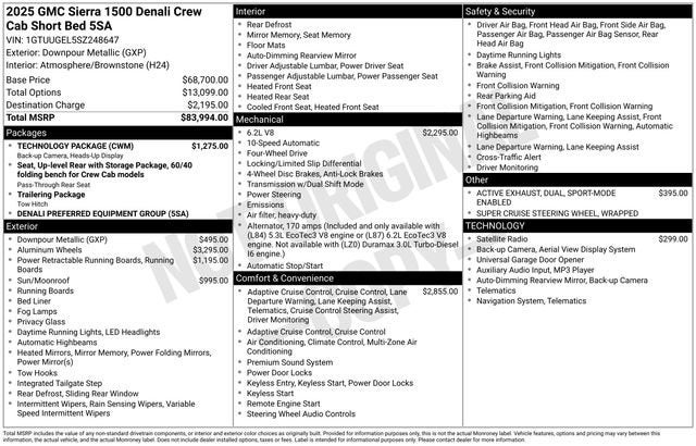 Clean CARFAX. Downpour Metallic 2025 GMC Sierra 1500 Denali 4WD 10-Speed Automatic EcoTec3 6.2L V8 10-Speed Automatic, 4WD, Atmosphere/Brownstone Leather.